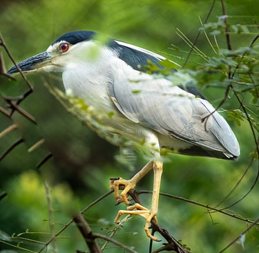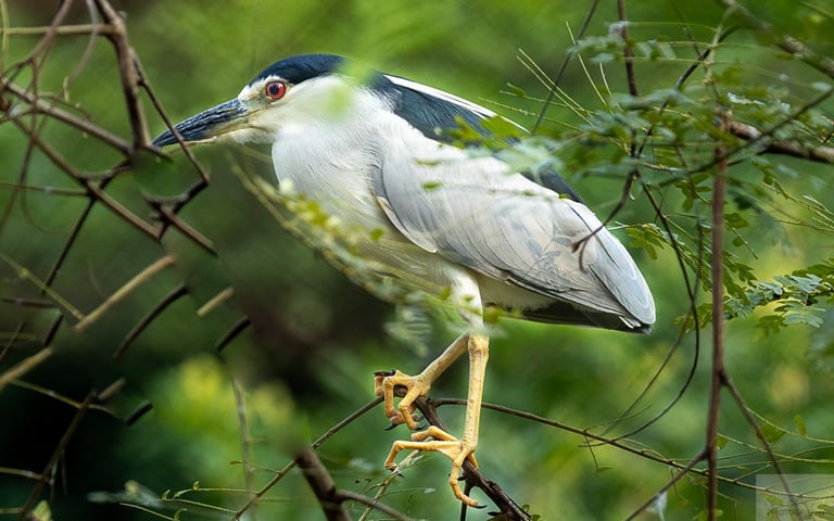 The Black-crowned Night Heron has a stout, black bill and red eyes in adulthood. Their legs are typically yellow-green but turn pink during the breeding season.